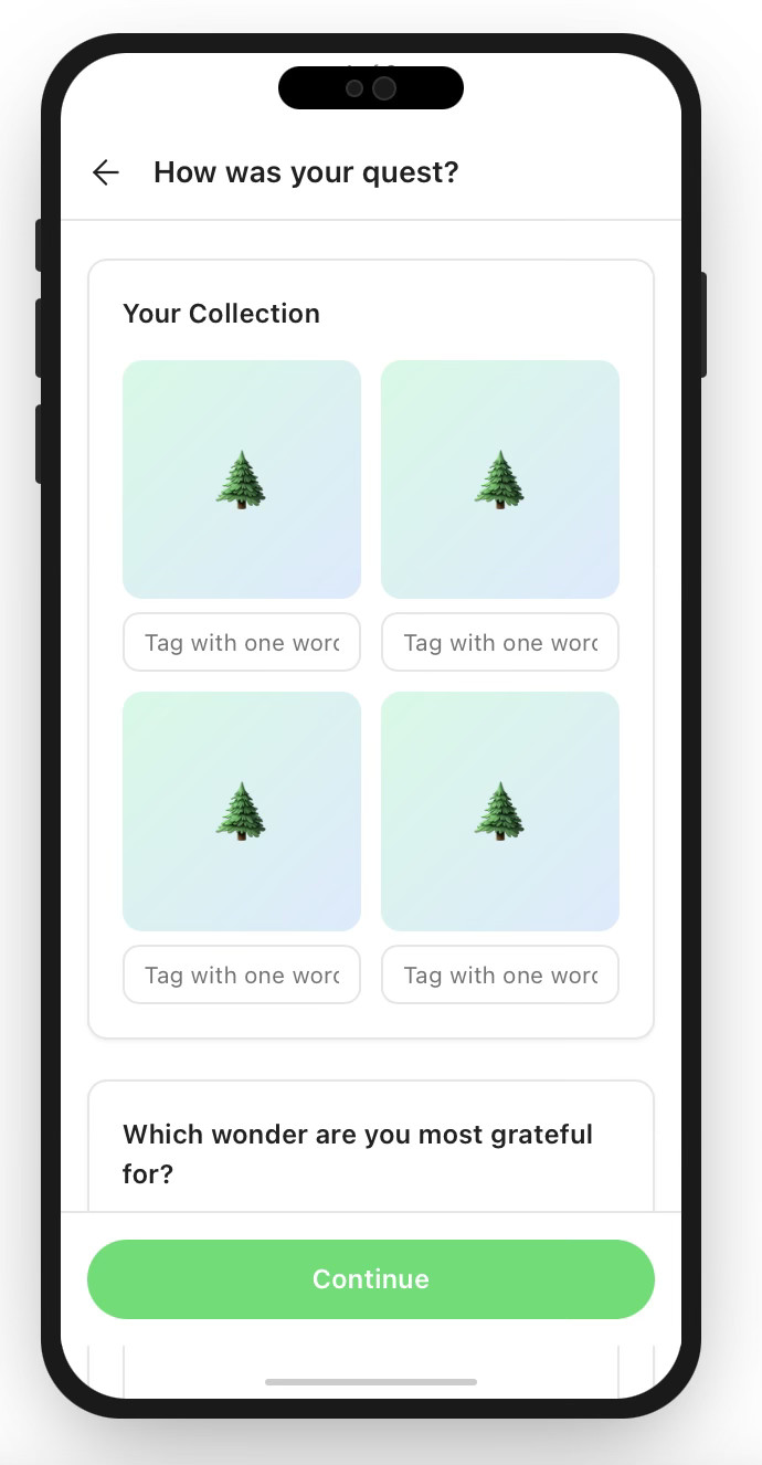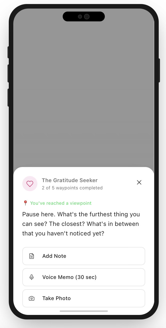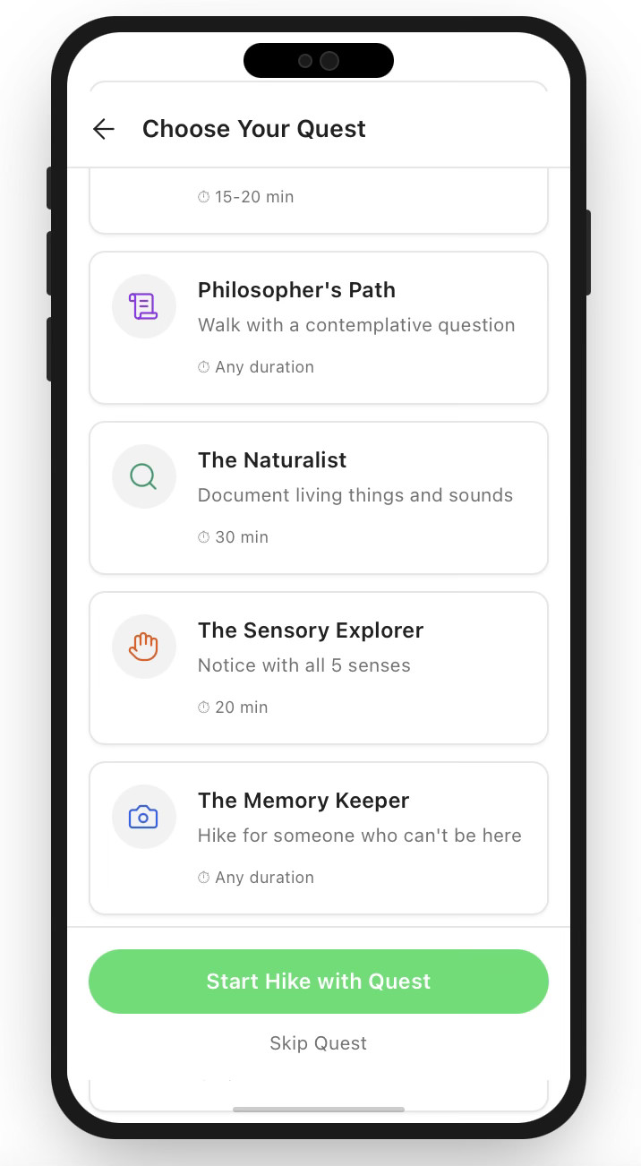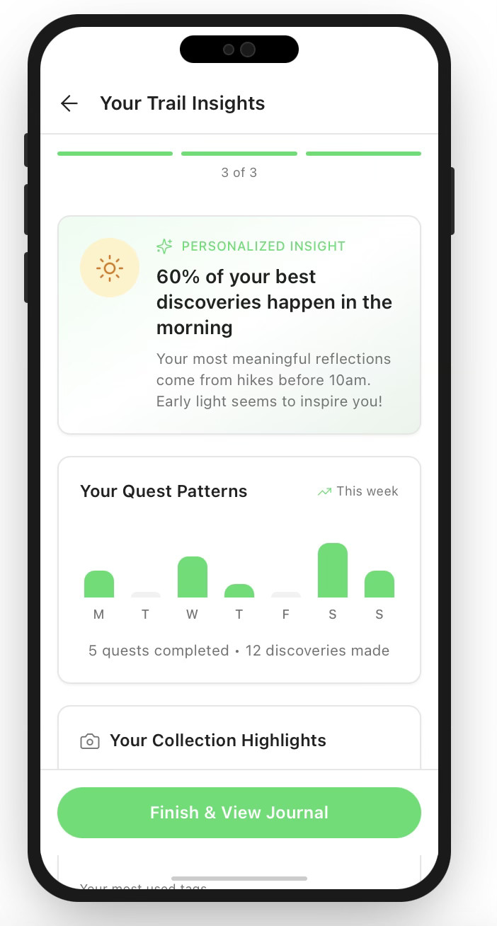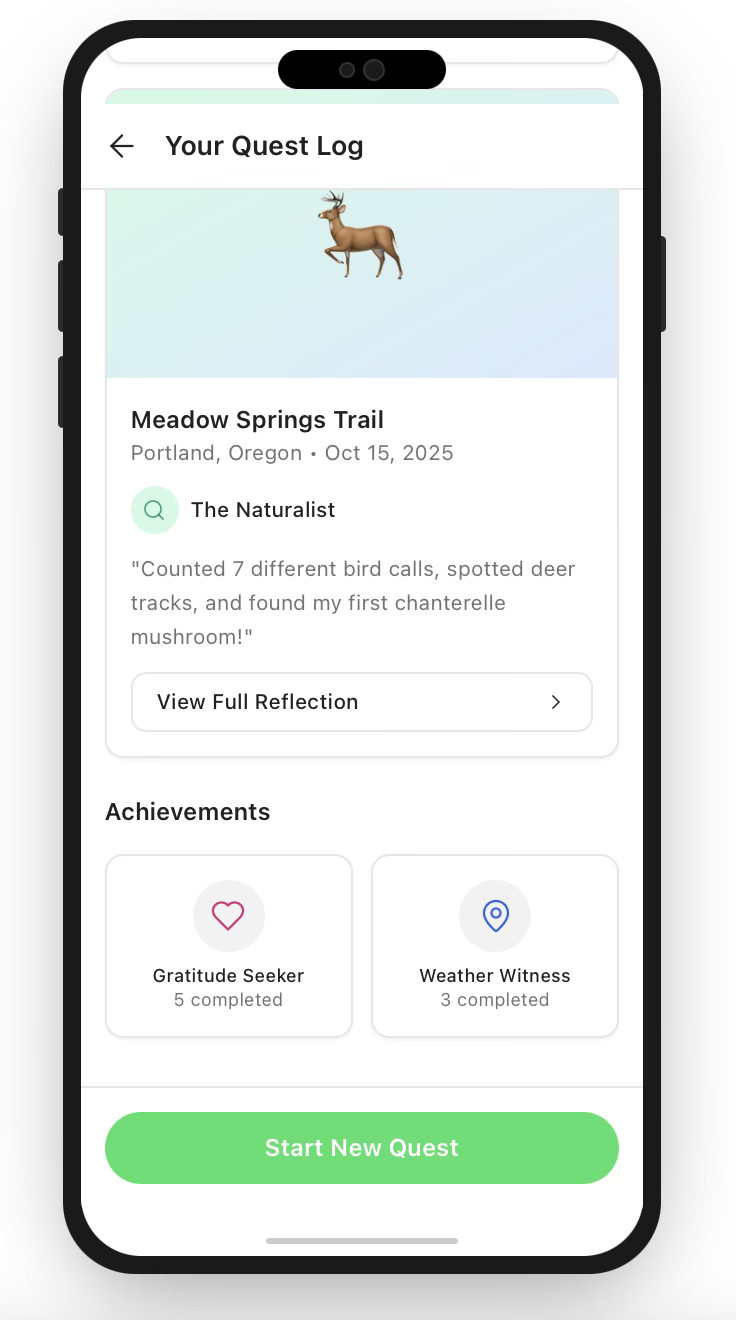 Every hiker seeks something different on the trail, whether gratitude, curiosity, reflection, or memory. Quests meet those unique motivations while helping users uncover patterns and insights that make their outdoor experiences personally meaningful.