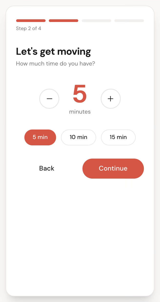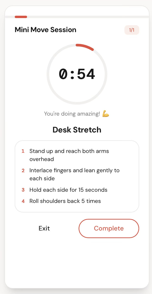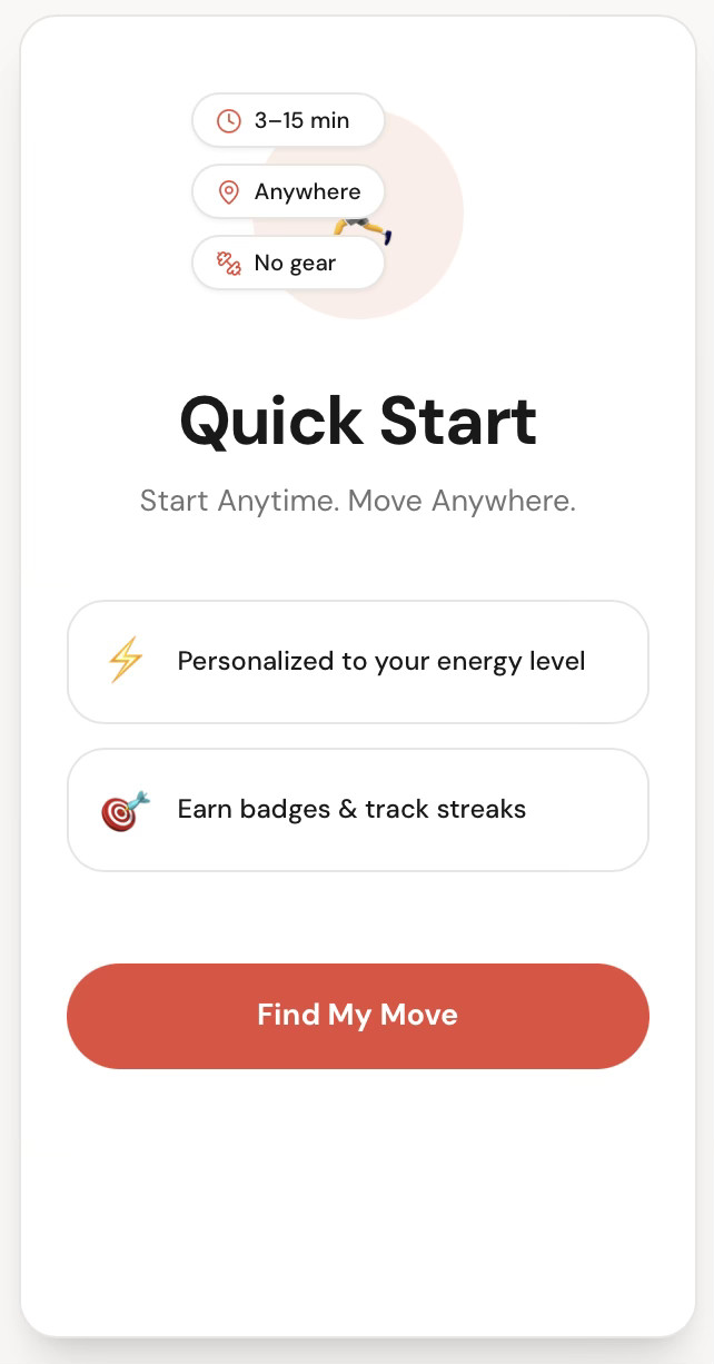 Mini Move creates a fast path from “I have a few minutes” to “I’m exercising.” It generates context-aware movement in seconds, adapting to time, energy, and environment.